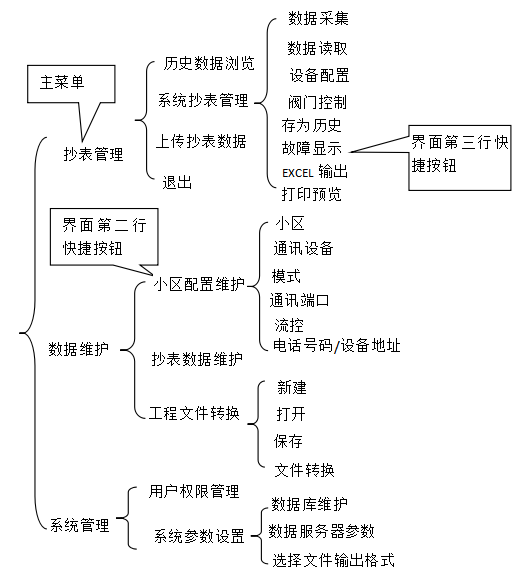 本系统具有数据采集与读取、设备配置、总线制阀门控制、手持机抄表管理、系统管理、数据维护以及用户权限管理、收费数据浏览、报表输出等功能。
